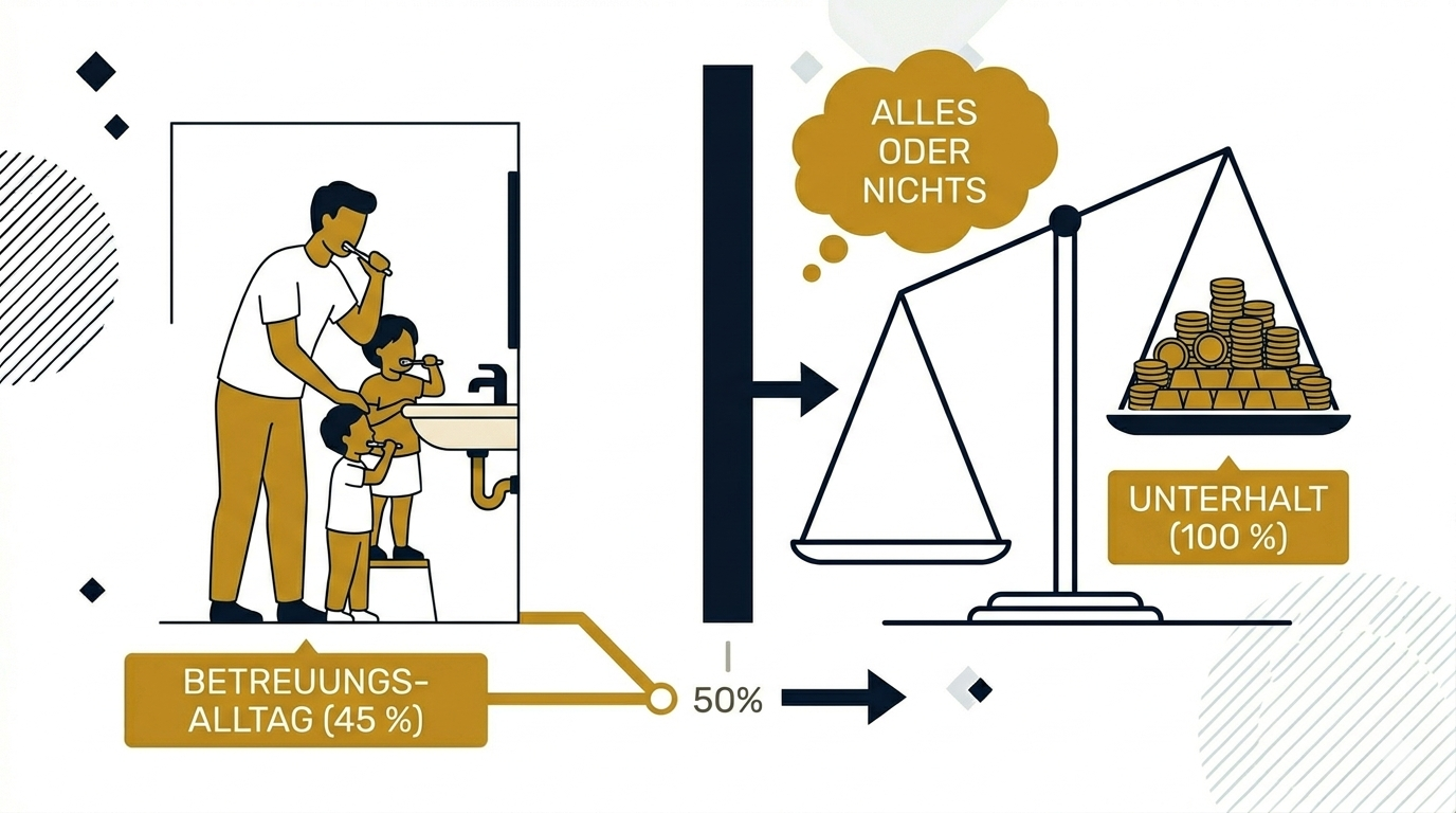 Das ist das Alles-oder-Nichts-Prinzip des deutschen Unterhaltsrechts. Es kennt im Wesentlichen nur zwei Zustände: Residenzmodell — ein Elternteil betreut überwiegend der andere zahlt voll. Wechselmodell ab 50 % — dann wird Betreuung anerkannt.