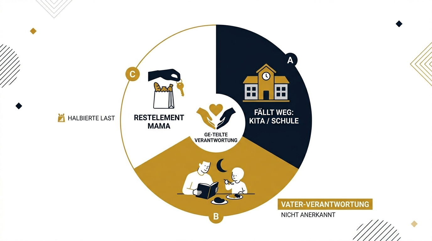 Ein Kind verbringt durchschnittlich 8 Stunden täglich in Kita oder Schule. In dieser Zeit liegt die Verantwortung bei der Einrichtung — nicht bei der Mutter. In den Abend- und Wochenstunden die das Kind beim Vater verbringt — oft 10 bis 14 Tage im Monat — trägt der Vater die volle Verantwortung. Vollständig. Ohne finanzielle Anerkennung. Ohne Abzug beim Unterhalt.